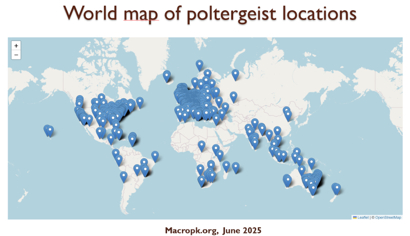 A new feature has also been added. It allows you to view the locations of poltergeist cases directly on a map. The cases to be located can be selected according to: their historical period, their duration, the level of testimony attributed, the presence of certain types of event (choice from 93 phenomenological parameters).